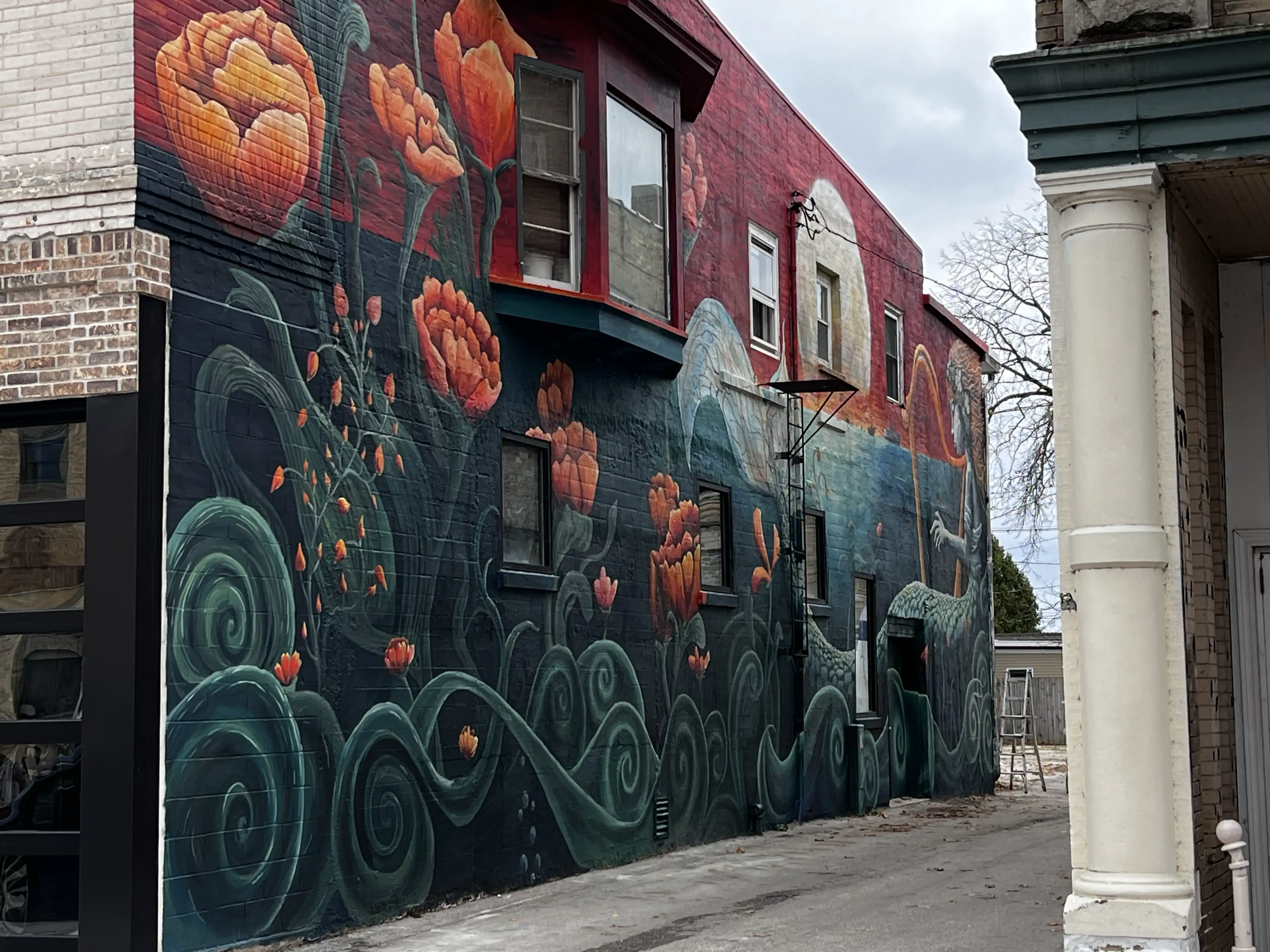 This mural dives into the cultural currents of Algoma’s identity, where mythology meets community. The figure of the mermaid, with flowing hair crowned in flora, evokes an ancient guardian of the Lake—her presence both mesmerizing and protective. Her harp, a universal symbol of harmony and rhythm, suggests a symbiotic relationship between nature and human endeavors. The mermaid’s song is not only for the fishermen but also for the alley’s visitors, pulling them into an underwater dreamscape of vibrant orange blossoms, swirling currents, and moonrise-drenched waters.