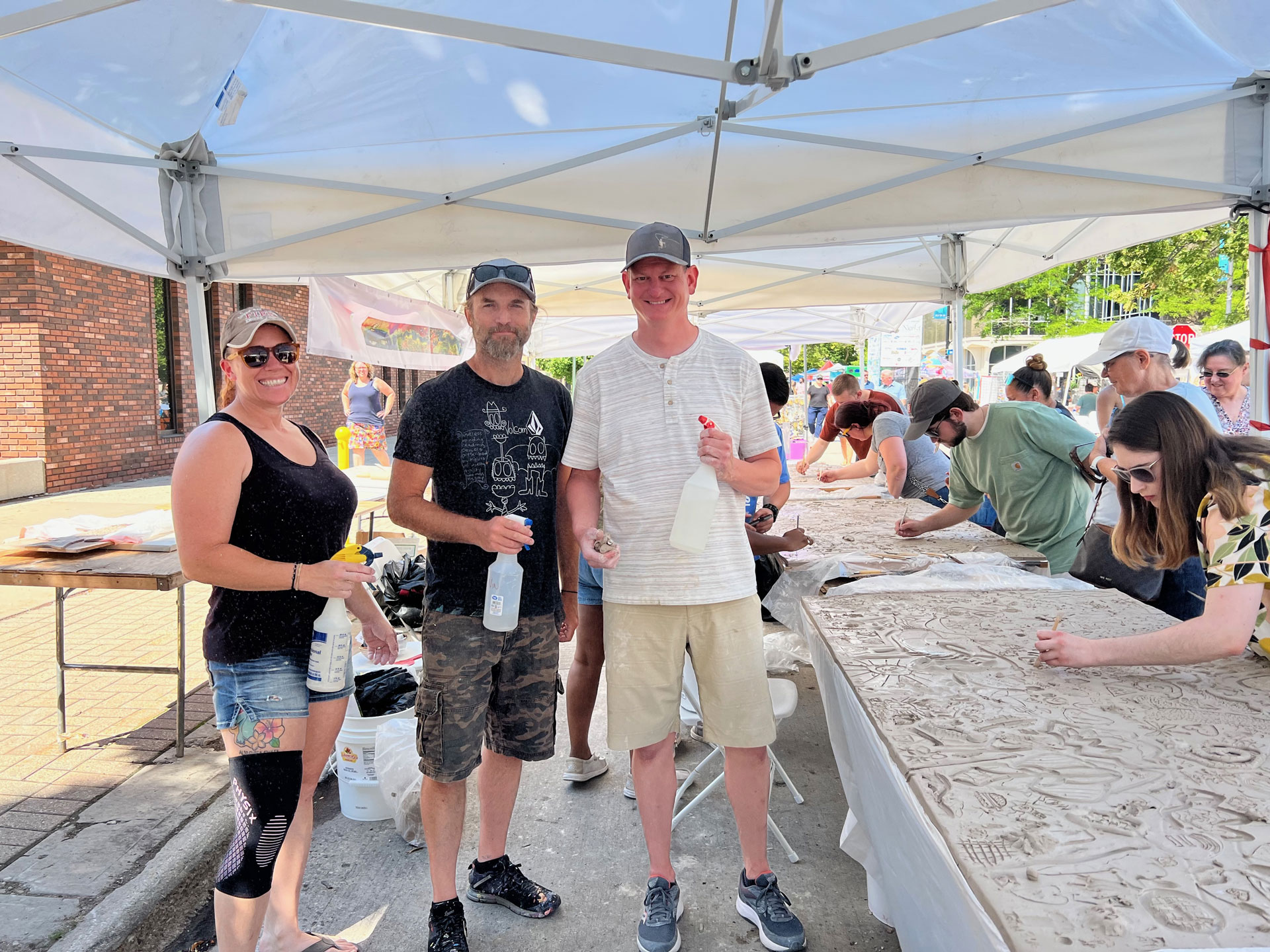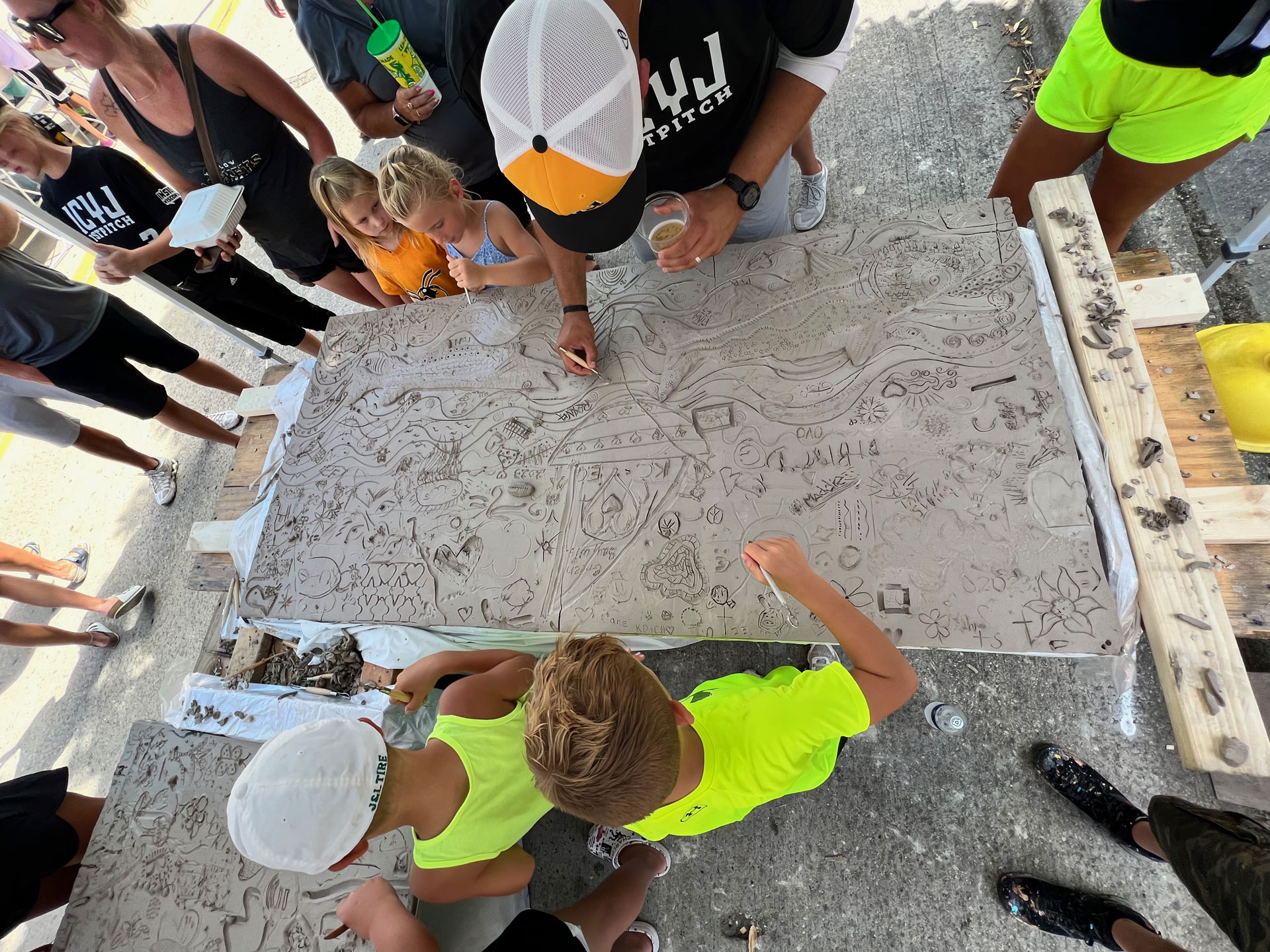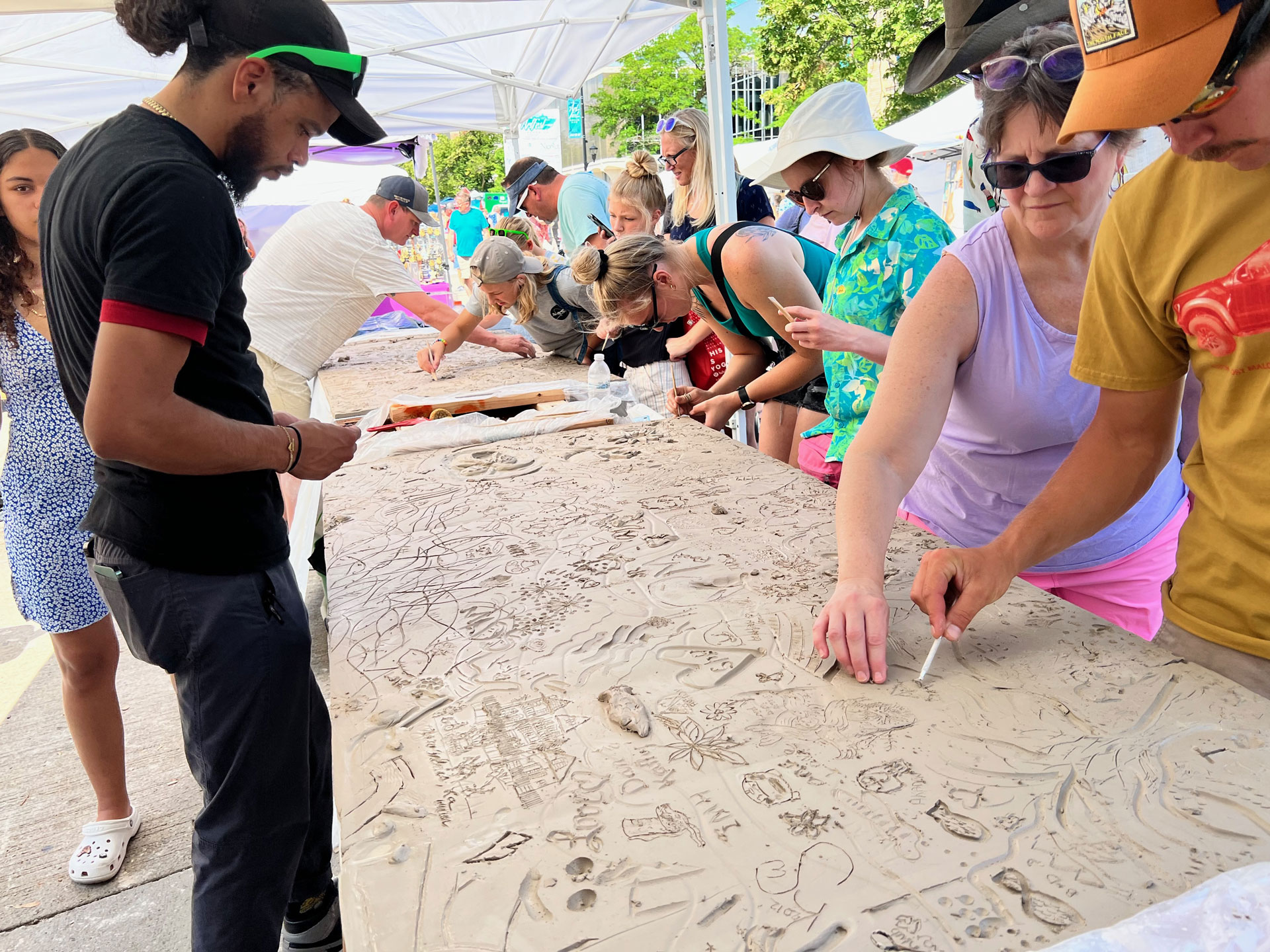 The collaborative aspect of the project was designed to span two days, July 29th and 30th. On the first day, participating artists would scribe imagery into clay tablets or add low relief clay to create additive textures. On the second day, these pieces would be colored with glaze, adding vibrancy and depth to the artwork. After many months of drying in Keith’s studio, he and his wife, Sarah Carter, meticulously prepared the panels for installation. The mural was installed on November 11th and dedicated on November 21st.