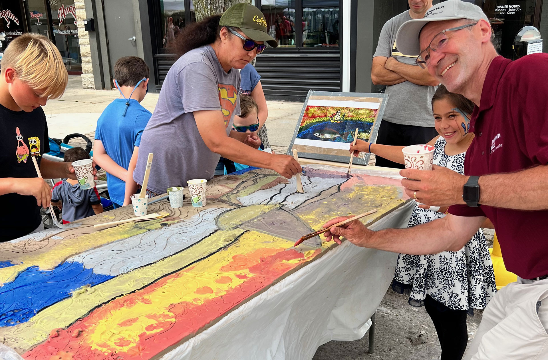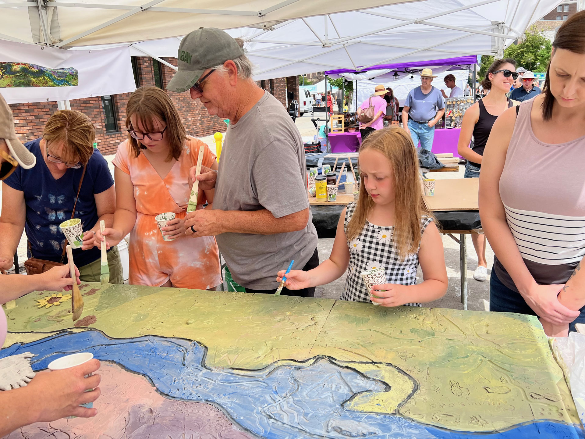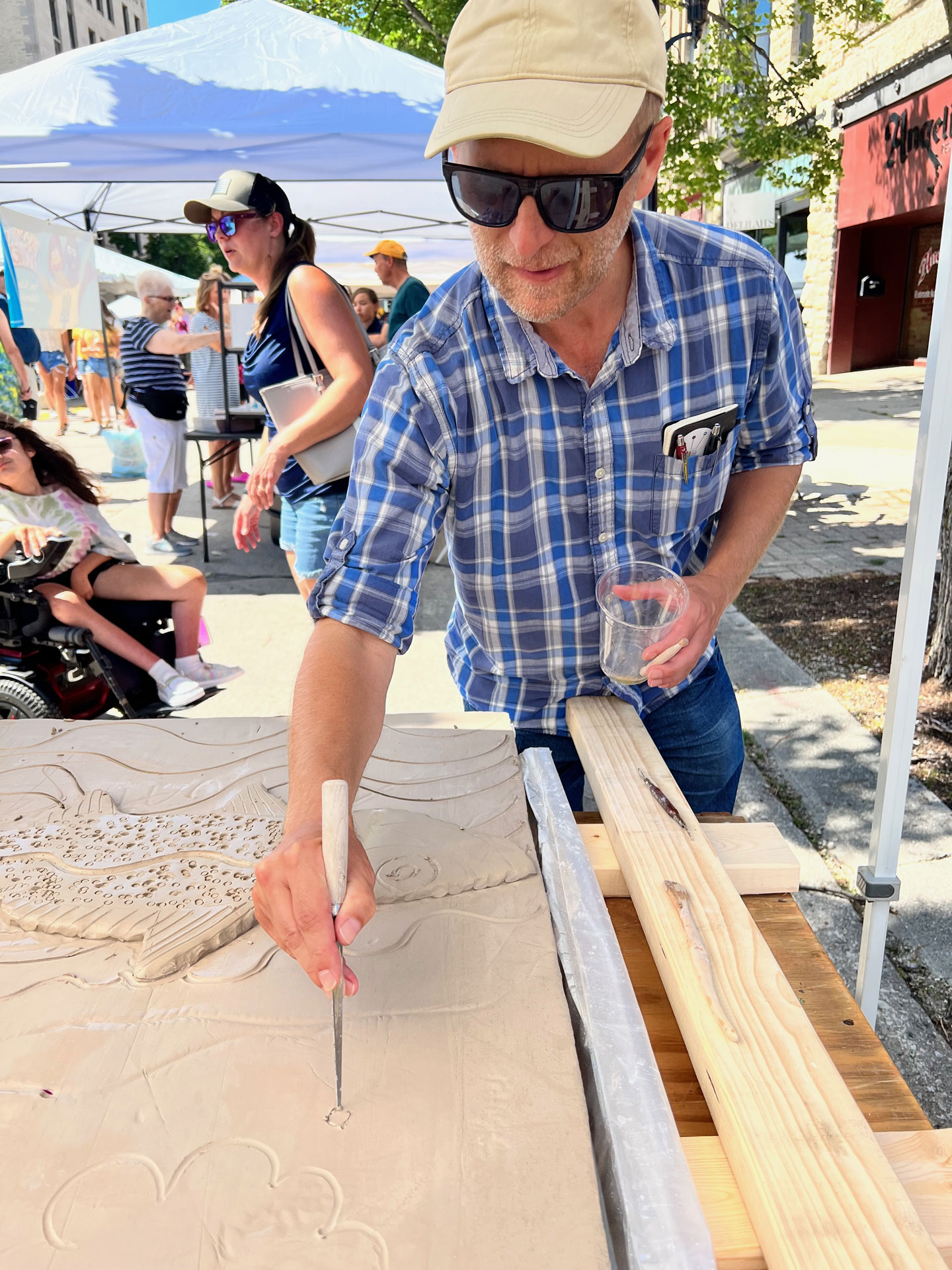 The collaborative aspect of the project was designed to span two days, July 29th and 30th. On the first day, participating artists would scribe imagery into clay tablets or add low relief clay to create additive textures. On the second day, these pieces would be colored with glaze, adding vibrancy and depth to the artwork. After many months of drying in Keith’s studio, he and his wife, Sarah Carter, meticulously prepared the panels for installation. The mural was installed on November 11th and dedicated on November 21st.