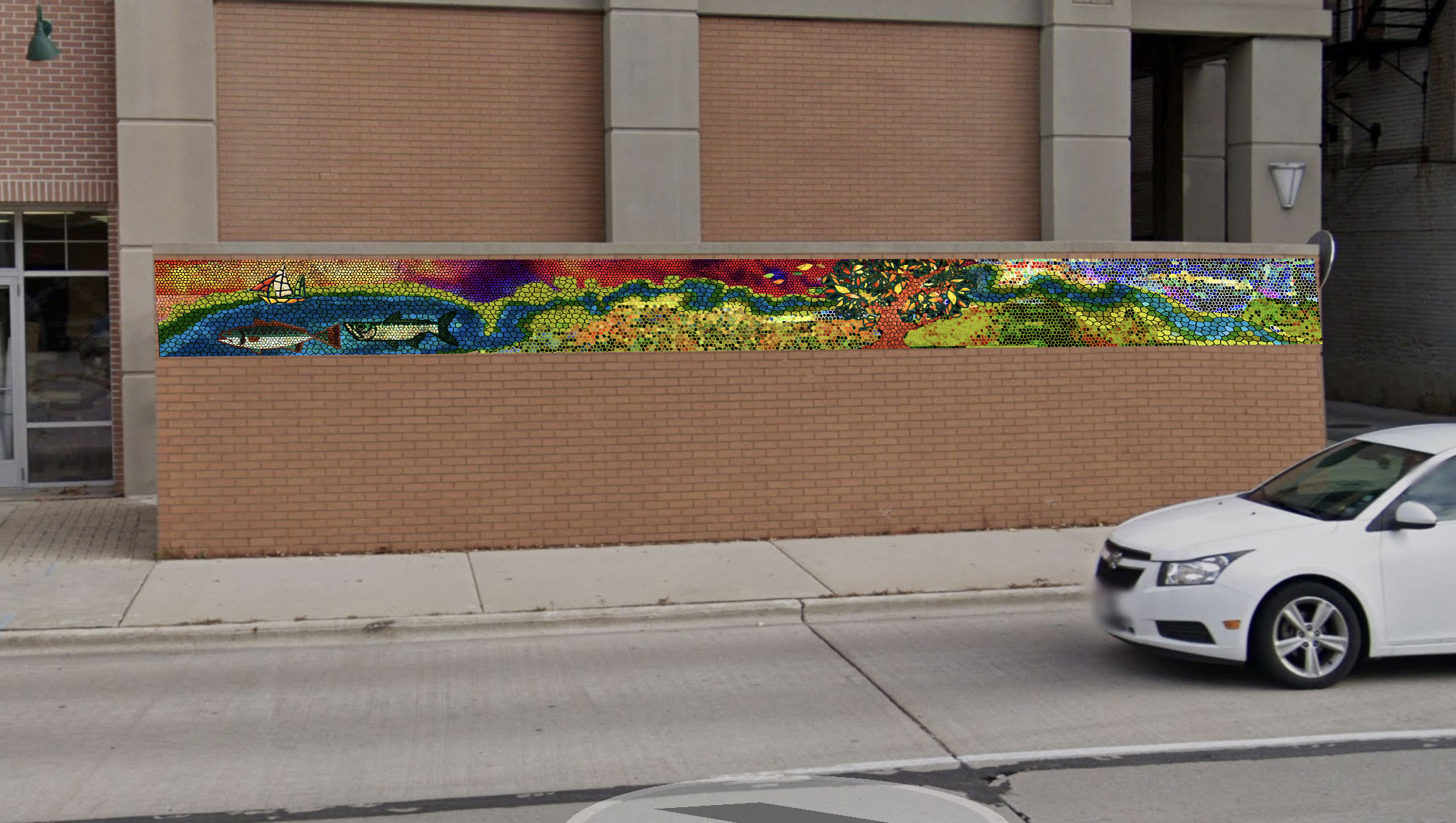 After contemplating the subject matter, I decided that the Fox River would serve as an ideal inspiration. The river is a vital lifeline, dividing Green Bay into two halves and playing a significant role in the city’s history and development. The chosen location for the final installation was 238 E Walnut Street, on a retaining wall by a parking garage. This wide expanse was perfect for a horizontal representation of the river, allowing for an expansive, detailed portrayal.