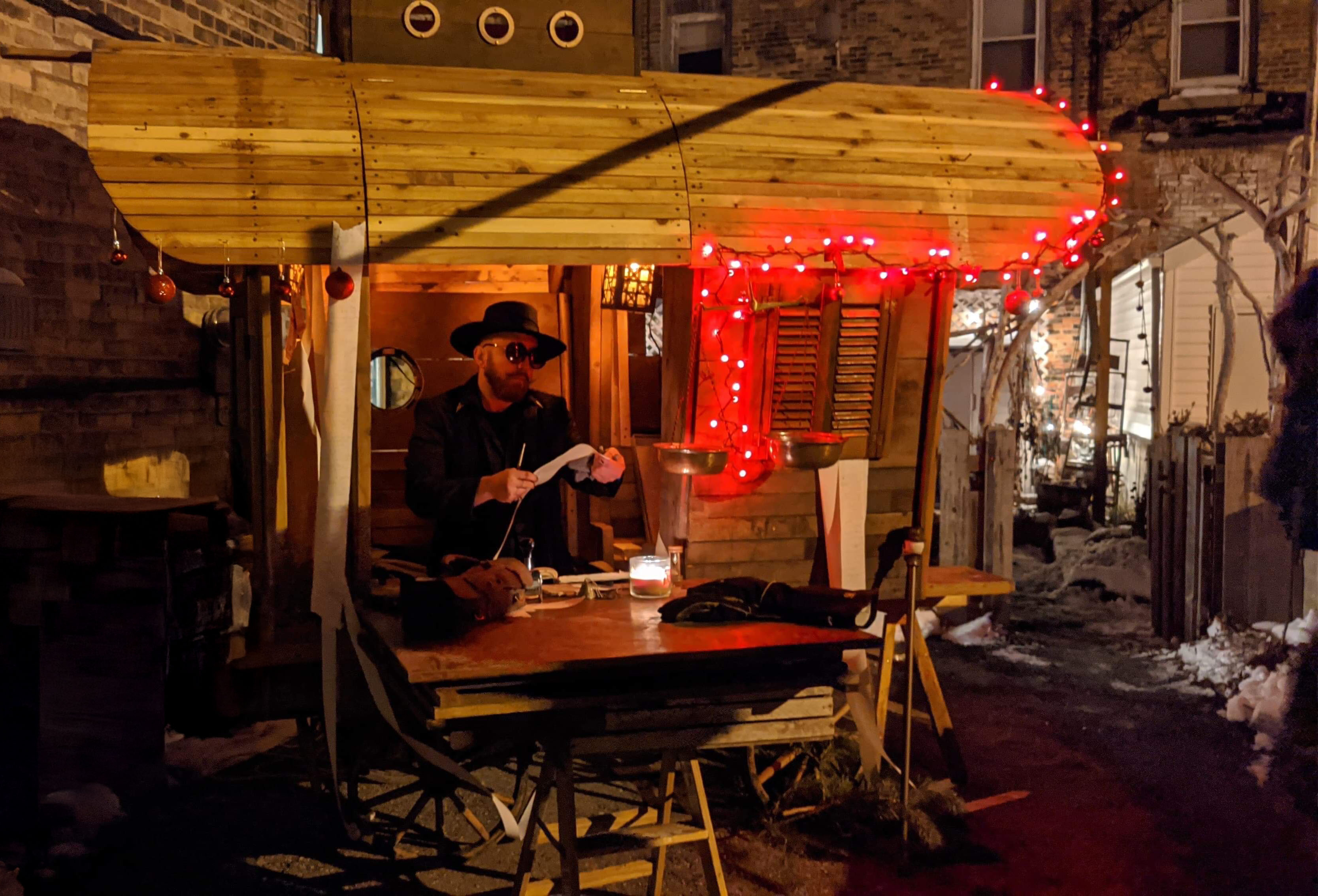 At the Threshold of Fate – The Keeper of the List Shrouded in the crisp night air, The Keeper of the List (played by Yonder favorite, Chris Rand) stood beyond the shop, an enigmatic figure poised before the flames. Guests, clutching mysterious invitations riddled with cryptic inscriptions, approached. One by one, the Keeper lifted the parchment to the candlelight, watching as hidden messages were revealed—a decree from the shadows: Were you good, or had your deeds doomed you? With their judgment sealed, revelers then warmed themselves by the fire afterward, sipping mulled wine and nibbling on sweet confections, laughter mingling with whispers of fate.
